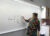 Person i orange tröja står i ett ljust klassrum med vita väggar, blå dörrar och hängande dekorationer från taket. I bakgrunden syns fönster med utsikt mot träd samt färgglada konstverk och material för skapande.
