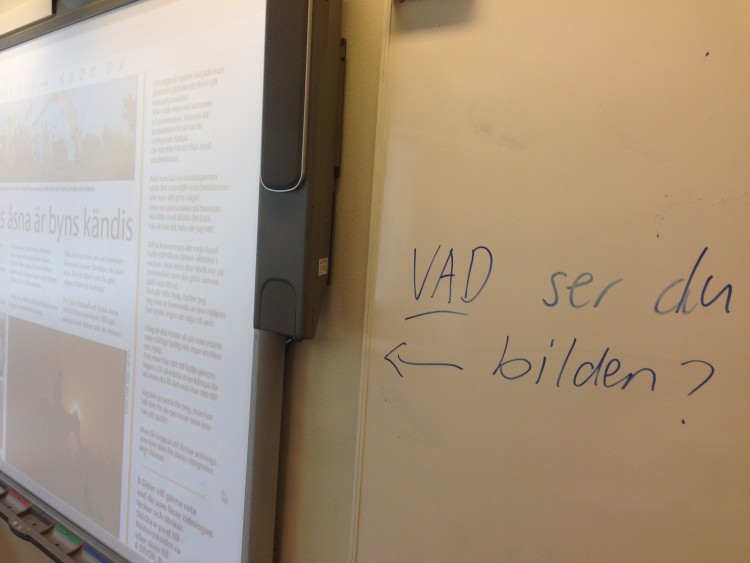 Bilder är ett bra verktyg när vi pratar om språkutvecklande undervisning, bilden sätter igång tankar och får eleverna själva att söka efter orden och vilja formulera sig. Först tittar vi på en artikel med bild och rubrik från 8 sidor (som för övrigt är en tidning innehållande ypperliga och lagom lättlästa artiklar) för att locka fram tankar och språk. -Vad tror ni att texten handlar om? är frågan. Det är nu eleverna börjar prata och resonera kring artikelns innehåll, främst utifrån bilden och rubriken; här bygger vi den viktiga förförståelsen. Eleverna får kortskriva kring vad de ser på bilden eller vad de tror artikeln handlar om. Det är sedan viktigt att lyssna när kompisar läser upp vad de har skrivit, det är ju så kort och går bra fort.