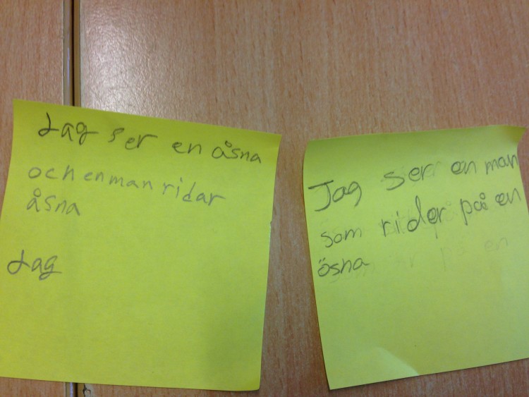 När vi har byggt upp vår förförståelse och skrivit ord och begrepp utifrån vad vi tror att artikeln handlar om börjar vi läsa om Ahmed och hans åsna. Ibland läser jag först och elever antecknar stödord. Lika ofta läser eleverna högt.