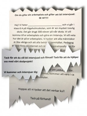 Eleverna delades in i grupper om tre. De skapade affischer med frågan ”Vill du bli intervjuad?”. Dessutom skrev de inbjudningsbrev till olika arbetsplatser där de ställde samma fråga.