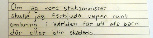 På Lindas plakat stod det ”Mat åt alla”. Linda berättar att det är för att alla inte har råd att köpa mat. När hon blir stor ska hon resa till fattiga länder och ge mat till de som är hungriga. Elmas plakat skrev ”Vård åt alla djur”. Hon berättar att hon har sett så många skadade djur, och vill att alla skadade djur i alla länder ska få vård.