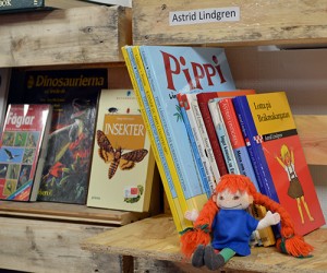 Det är byggt med återvunnet material och böckerna är hopsamlade från förskolans alla avdelningar och föräldrarna. Det är barnens bibliotek och här bestämmer de det mesta. Här finns t.ex. inte plats för några vuxenpärmar.