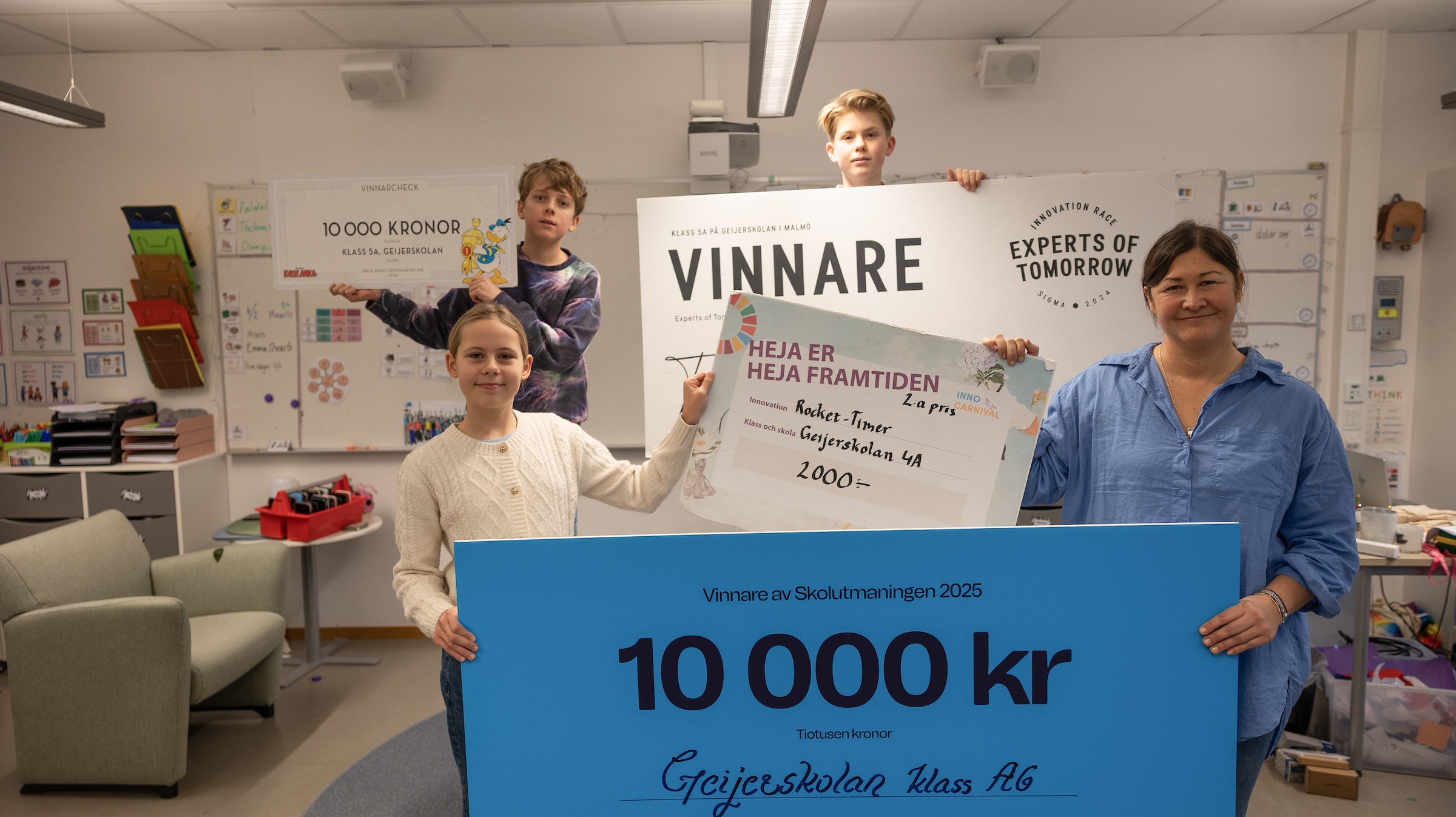 I klassrummet på Geijerskolan står de stora kartongskivorna med prischeckar uppradade; de senaste åren har Desirée Bentzer och hennes mellanstadieklass deltagit i många tävlingar och vunnit flera av dem. Dusch-uppfinningen “Rocket-timer”, en hållbarhetsinnovation som hjälper användaren att spara vatten, är bara ett exempel. Det var i samband med att hon deltog i InnoCarnival som mycket föll på plats för henne.