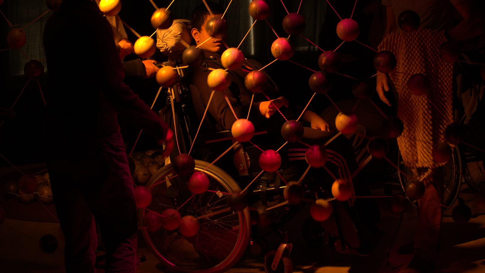 En bit bort i rummet utforskar en annan elev tyngden i ett runt klot. Han plockar upp det och kastar det sedan med all kraft åt Lisbeth Hagerman, som i sin tur fångar den och speglar eleven och rullar tillbaka bollen. Bara en kvart tidigare var samma elev skeptisk till Lisbeth Hagerman och de träkulor som hon då placerade i elevens hand. Då puttade han bestämt bort Lisbeth Hagermans hand. Men nu sträcker han istället ut båda sina händer och väntar ivrigt på att hon ska skicka tillbaka bollen. Hans ögon lyser i det mörka rummet.