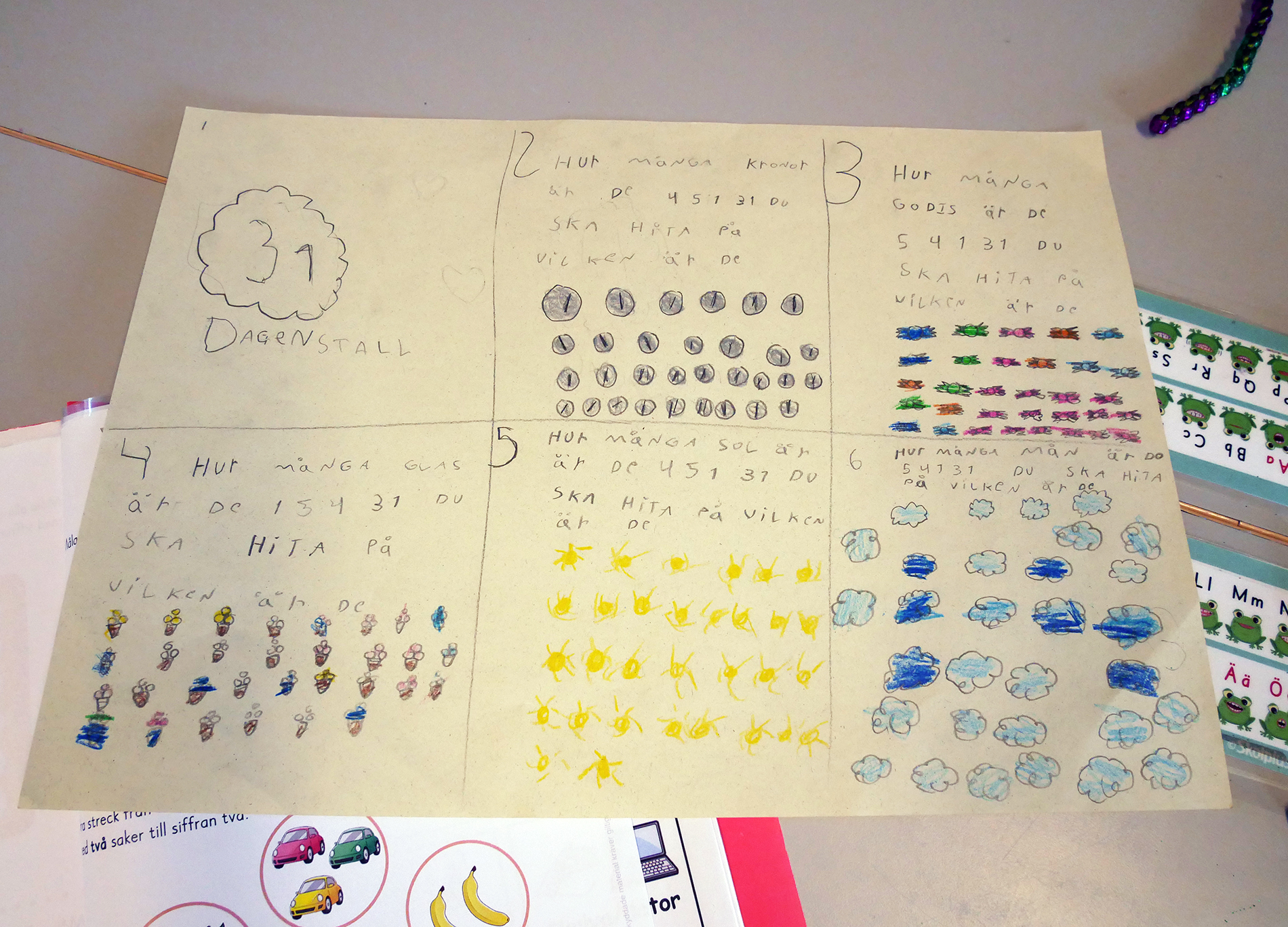 Eleverna hade tagit inspiration av ”dagens tal”, vilket är något de arbetade med dagligen i klassen. Då arbetar klassen tillsammans utifrån dagens datum och kan till exempel skriva dagens datum i siffror, ta reda på om det är ett jämnt eller udda tal och räknar hur många vokaler det finns i den aktuella dagen.