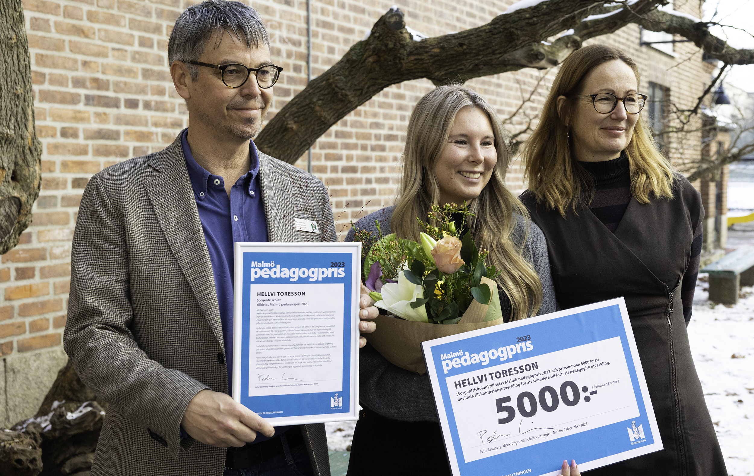 Hellvi Toresson på Sorgenfriskolan hade precis avslutat en lektion när hon överraskades av grundskoledirektör Peter Lindberg och Sara Wettergren (L), skolkommunalråd, som dök upp. Ballongerna och blommorna avslöjade att det var något stort och festligt på gång, men det var först när Peter berättade varför han kommit dit som jublet utbröt. Hellvi är grundskoleförvaltningens vinnare av Malmö pedagogpris 2023!