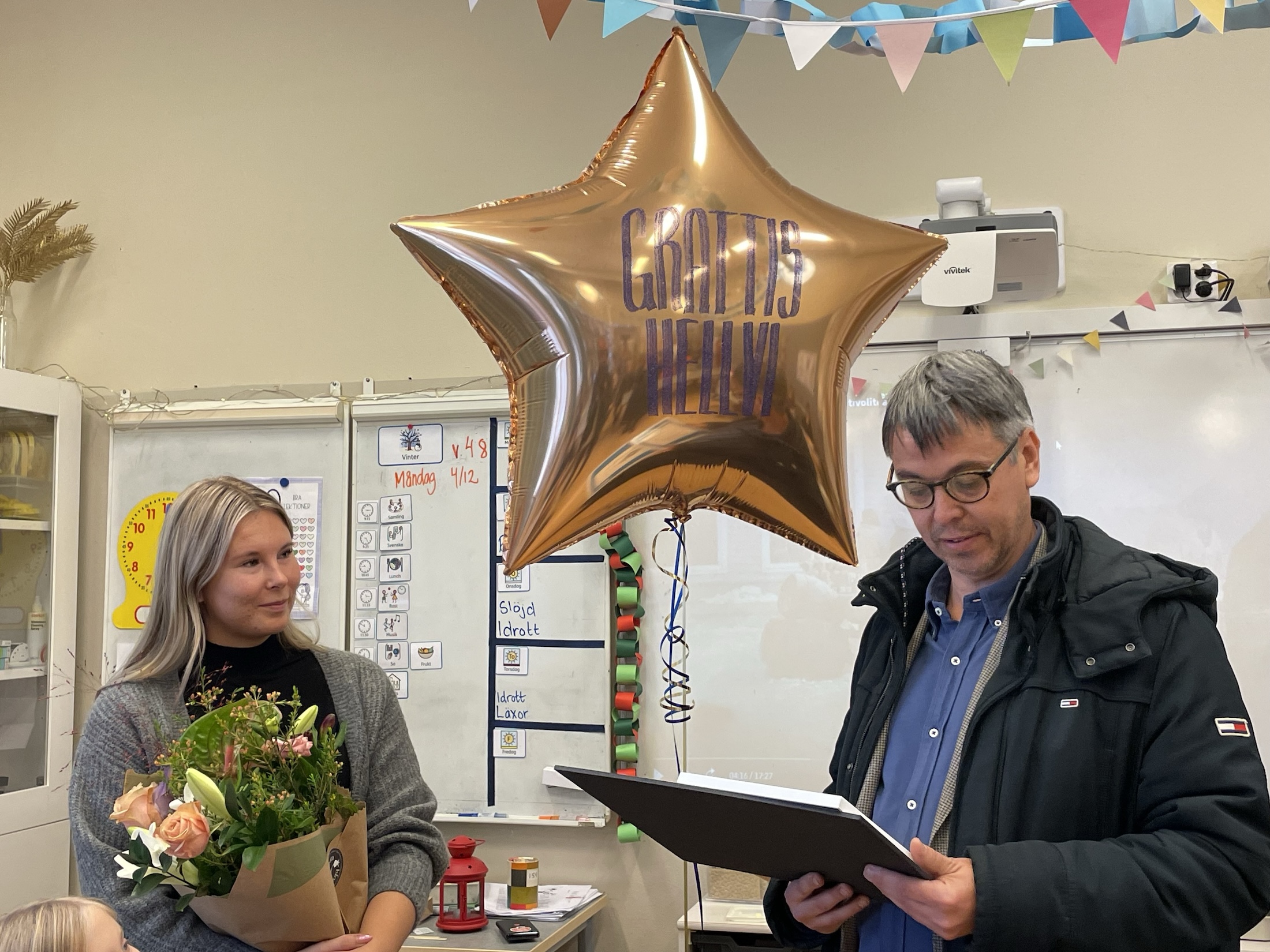 Hellvi Toresson gratuleras i klassrummet med blommor, ballong och konfettiregn.