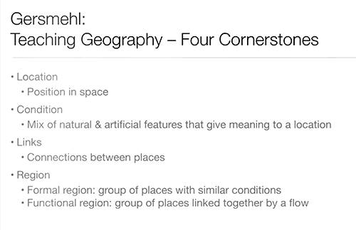 Puentedura går igenom Gersmehls fyra hörnstenar för att undervisa geografi.