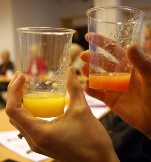 – Det är samma juice i båda glasen, men den ena har karamellfärg i sig, avslöjar Katarina.
