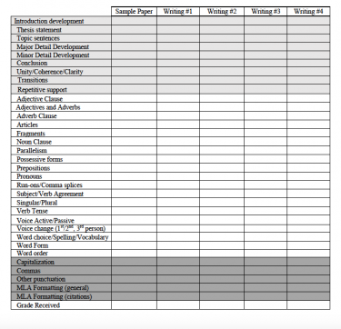 Tabellens olika kolumner fyller olika funktioner. I kolumnen till vänster hittar man de olika kategorier/aspekter som bedöms, d.v.s. vanliga brister i texter. Det kan handla om disposition av innehåll, grammatik, stavning/formalia eller andra aspekter som är viktiga för den aktuella texttypen. Till höger om de olika aspekterna finns en kolumn till respektive textversion/uppsats. Det är alltså här man noterar bristerna i de olika texterna som eleven skriver under en kurs. Tabellen anpassas efter skrivuppgiften/texttypen men också efter elevgruppen så att man får med de kategorier/aspekter som verkligen är relevanta för texttypen och för att säkerställa att man lägger bedömningen på rätt nivå för den aktuella elevgruppen. I början av terminen är Christina Torres noggrann med att gå igenom denna tabell och dess olika aspekter av brister för att eleverna ska kunna tolka tabellen själva senare.