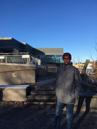 Efter att jag skickat in Apelgårdsskolans arbete med Zlatan Plaza till uttagningen till Golden Cubes Awards blev vi inte nominerade till finalen i Sydkorea, men fick en trevlig inbjudan till ARKiS -Arkitektur i Skolans nätverksmöte på ArkDes (Arkitektur och Designcentrum på Skeppsholmen i Stockholm). Då min kollega fått förhinder och nätverksmötets tema var Plats för barn passade det alldeles utmärkt att ta med en av de elever som varit mest engagerade i projektet Zlatan Plaza. När jag tillämpat ett par extra urvalskriterier var valet av medföljande elev mycket enkelt.Elev utanför byggnad.