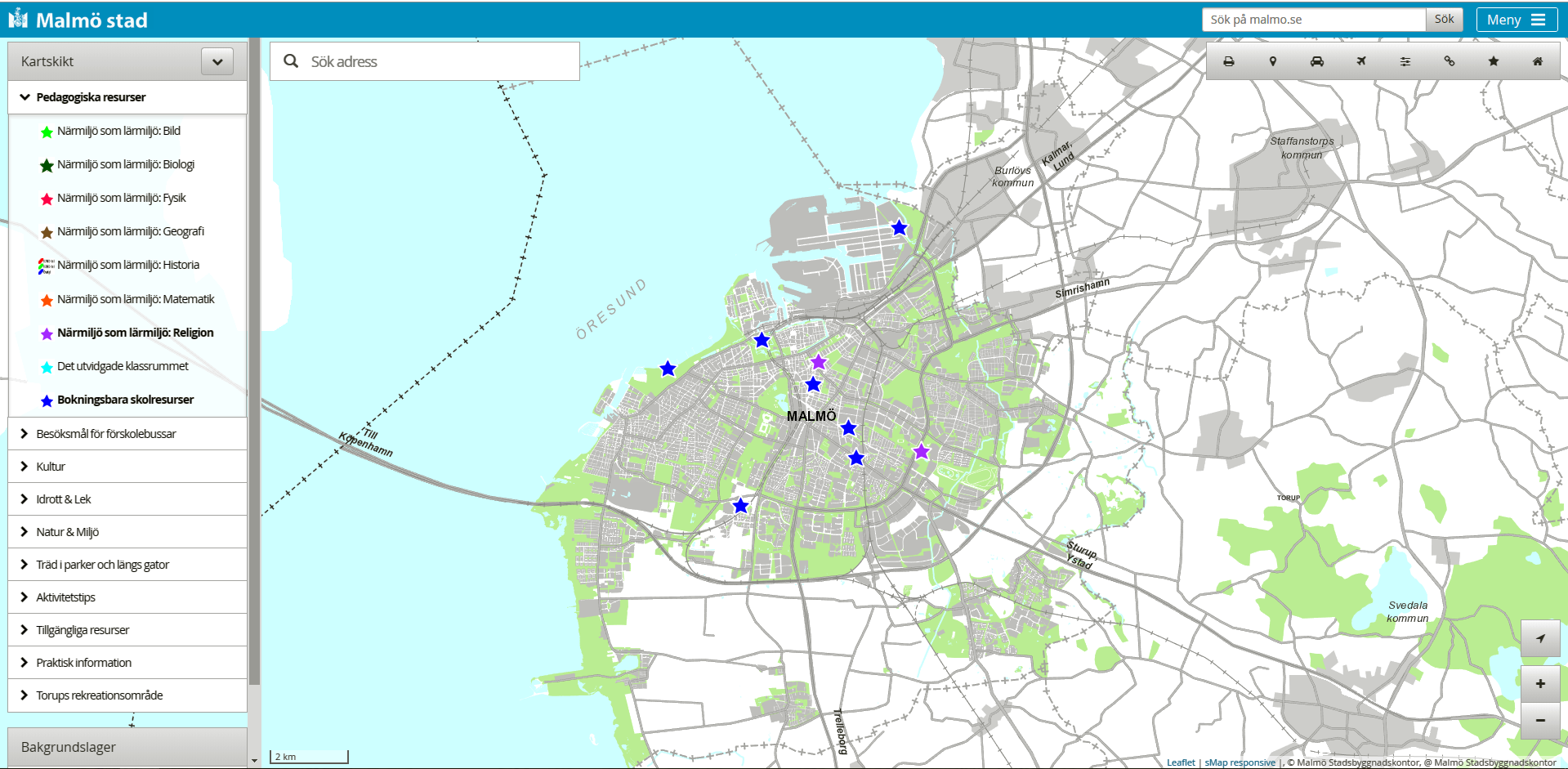 Via pedagogiska kartor kan du få en överblick över bokningsbara skolresurser som ni kan besöka med klassen. De resurser som finns i kartan är de resurser inom Malmö stad, kommunala bolag eller organisationer som samarbetar med Malmö Stad och som erbjuder pedagogiskt stöd i form av personal. Dessa aktiviteter är kostnadsfria för skolorna i Malmö och anknyter till stadens drift eller historia. Här hittar du: