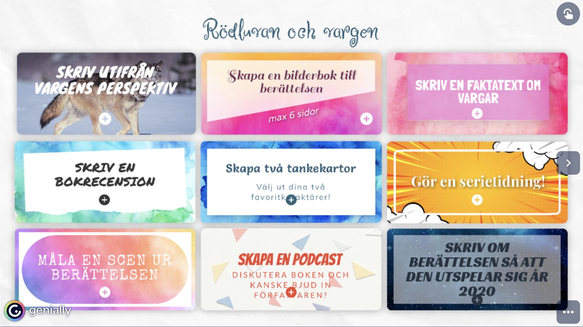 Oändliga är också sätten du kan skapa choice boards på. Du kan som exemplet ovan skapa en fysisk men du kan också skapa digitala med hjälp av Google-verktyg eller andra presentationsprogram som genial.ly eller Prezi. Fördelarna med att arbeta digitalt är att du kan klistra in bilder eller länkar till filmklipp, låtar eller texter.