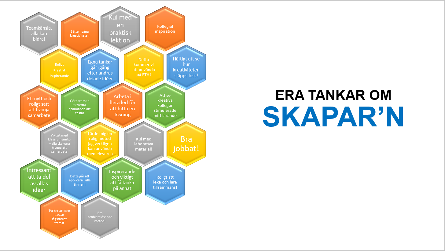 I slutet av workshopen fick personalen skriva en exit ticket där de fick kort formulera hur de hade upplevt att arbeta med Skapar’n. Reslutatet ser ni i bilden med bikupan. Det var så glädjande att se att metoden verkligen landade väl hos hela vår personalgrupp och att flera var inspirerade och ville börja använda metoden med sina elever på en gång. Möjligen är detta en bra påminnelse om att vi inte ska glömma att arbeta praktiskt med personalgrupper när vi vill implementera ett särskilt verktyg i undervisningen med våra elever.