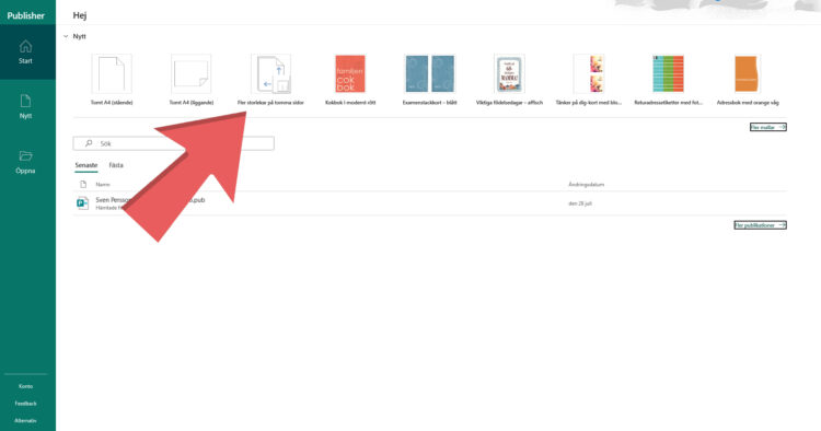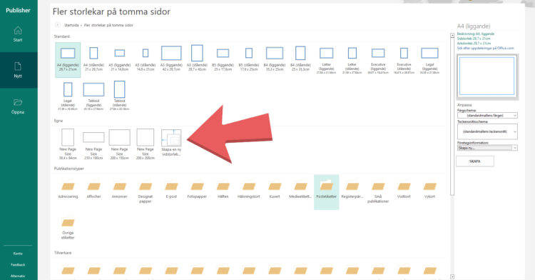 Steg 1: Starta programmet Publisher. Klicka på ”Fler storlekar på tomma sidor”.