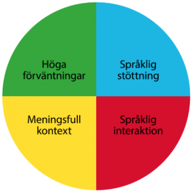 Språkutvecklingsstrategin lyfter den språkliga interaktionen som ett av fyra huvudområden som är kännetecknande för den språkutvecklande undervisningen. Det understryks också att eleven ska ges rikliga tillfällen till denna interaktion. De övriga fyra områden är språklig stöttning, höga förväntningar och meningsfull kontext.