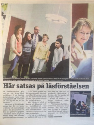Ny termin och nya utmaningar, och här om veckan hade vi besök av självaste ministern för idrott och kultur, Lena Adelsohn Liljeroth! Ministern var i Malmö för att se hur vi i skolan arbetar med läsförståelse, och det var roligt att kunna presentera Kroksbäcksskolans satsning på genrepedagogik, där det yttersta målet är att kunna ta in och förstå syfte och budskap för olika typer av texter. Ministern fick veta vad genrepedagogik innebär genom diskussion med rektorer, lärare och elever. Lena besökte också våra femmor som just nu arbetar med argumenterande text och modala verb tillsammans med sina lärare Robert och Fredrik.