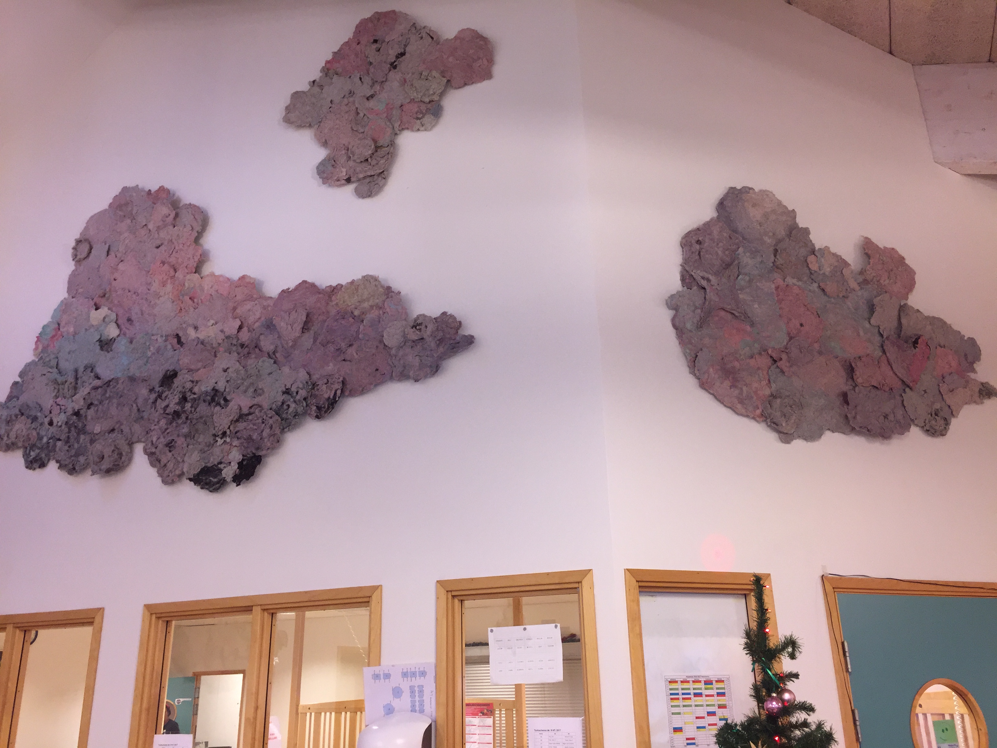 I diskussioner mellan skolan och konstnärerna landade man i att barnen skulle forma fantasimoln som man sedan fogar samman till stora gemensamma moln som tar plats i taket, himlen, i matsalen.