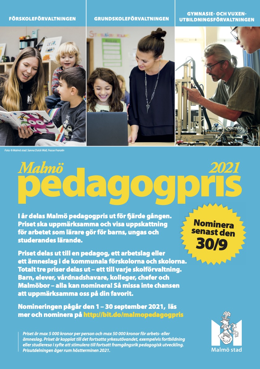 Barn, elever, vårdnadshavare, kolleger, chefer och Malmöbor – alla kan nominera en pedagog eller ett arbetslag till Malmö pedagogpris. Nomineringen sker 1-30 september. Du nominerar genom att fylla i formuläret här. Tänk på att skriva en motivering som får urvalsgruppen att förstå hur fantastisk just din favoritpedagog är!