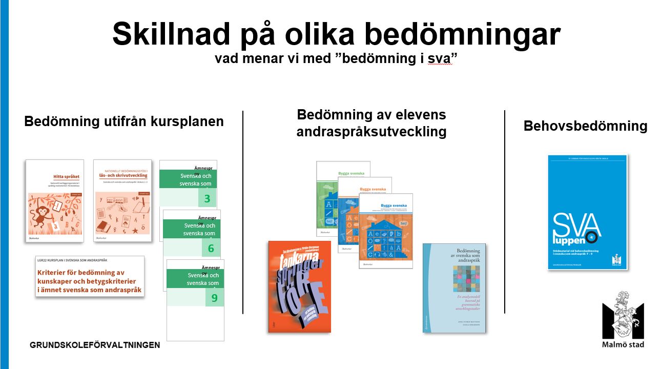 När det gäller andraspråkselever är det också viktigt att vi bedömer och följer deras andraspråksutveckling över tid. För detta kan vi till exempel använda Bygga svenska, som är Skolverkets kartläggningsmaterial för nyanlända elevers andraspråksutveckling. Där kan vi följa elevens språkutveckling när det gäller tala, läsa, skriva, lyssna. Syftet är att synliggöra elevens språkliga nivå för att kunna planera undervisning och stöttning framåt. Bygga svenska är inte kopplat till kursplanen i sva utan tar en bredare ansats gällande elevers andraspråksutveckling.