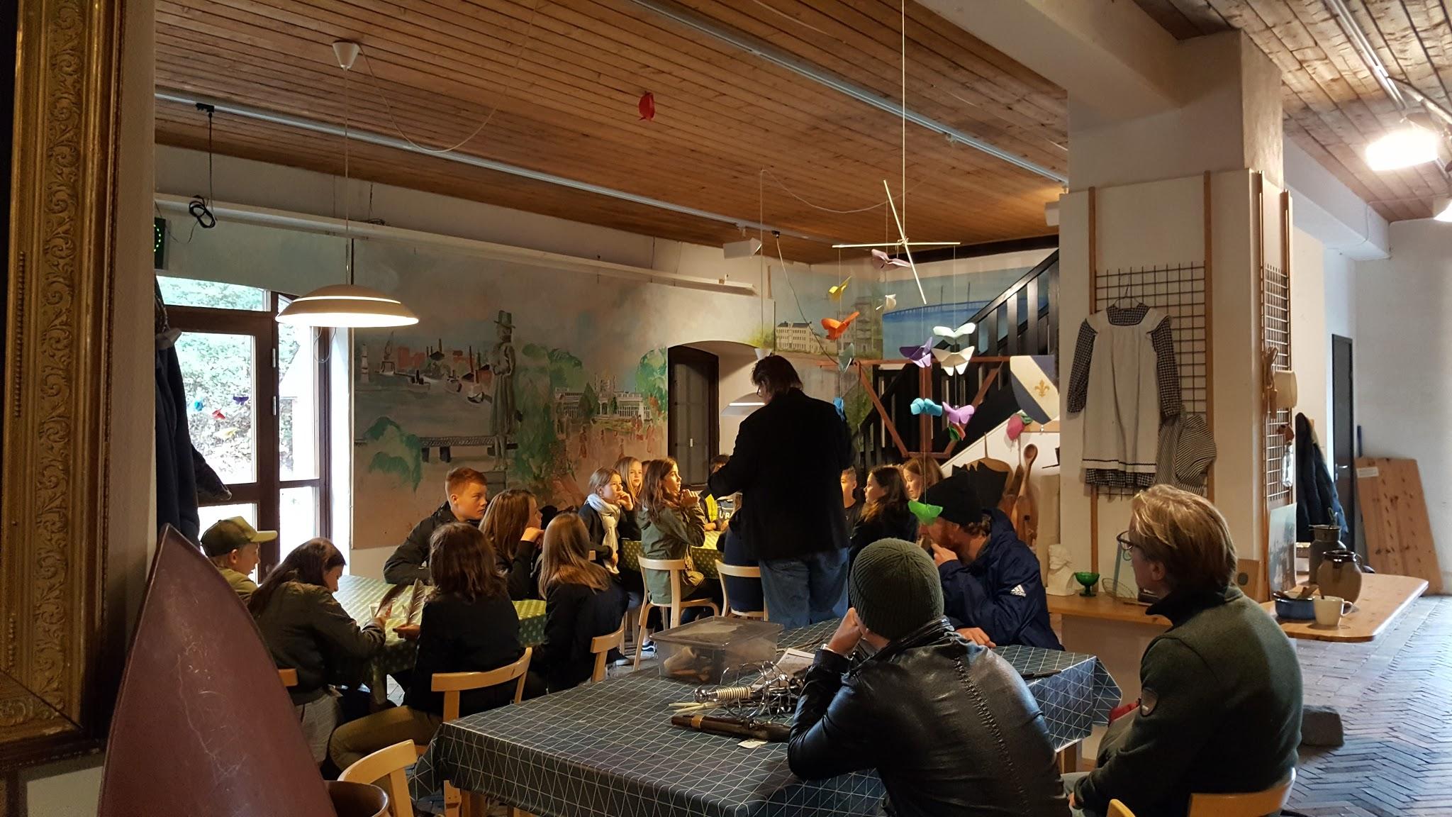 När visningen på slottet var klart gick man i helgrupp ner till Kommendanten och där visade Thomas hur man kunde göra en fjäderpenna. Därefter var det lunch som vi hade med från skolan.