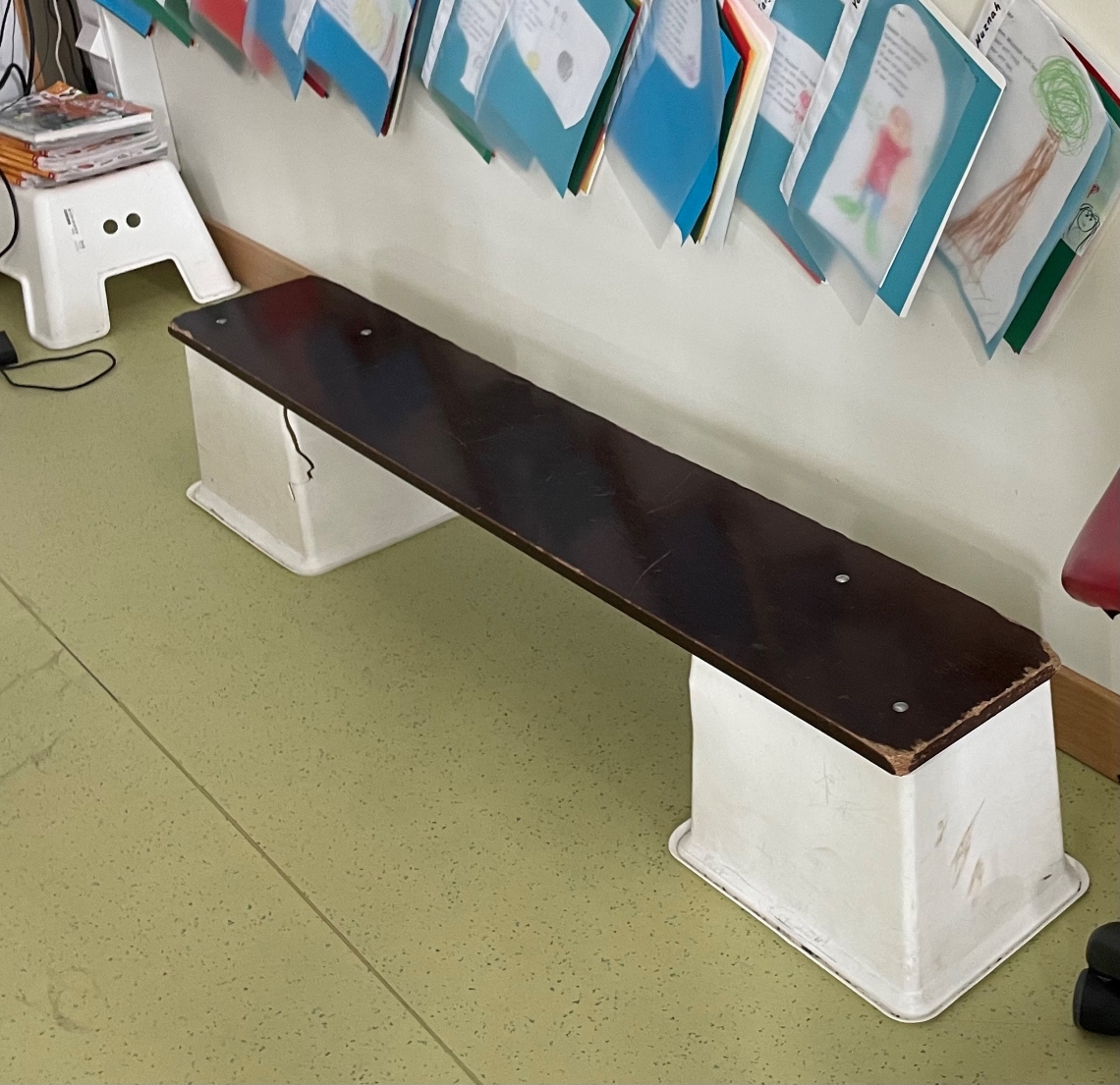 Benen på bänken var papperskorgar som var upp och nervända. Sedan satt man på en planka (eller om det heter hyllplan. Jag är lite osäker på när en planka är en planka. Är en planka en bräda förresten? Jag skriver planka i fortsättningen här i texten). Jag vet, det låter ostabilt. Lägger man en planka som balanserar på två upp och nedvända papperskorgar kommer den att tippa över om någon elev sitter längst ut när kompisarna på bänkens andra ände reser sig upp. Men inte här inte. Plankan var nämligen fastskruvad i papperskorgarna, inifrån papperskorgen. Resultatet blev en bänk som var lätt att flytta omkring, billig och enkel att tillverka.