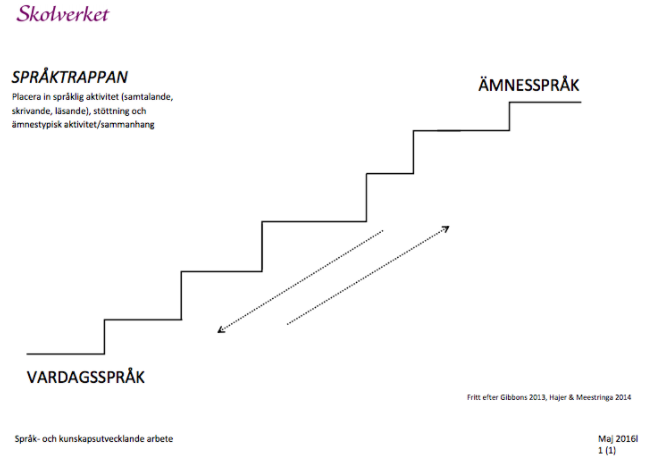 Många tycker att begreppet språkutveckling är svårt att förstå. Diskussionen som uppkom de första minuterna var kring själva begreppet. Som en introduktion och för att få alla kollegor att förstå vad det handlar om började vi med att tillsammans titta på och diskutera språktrappan. Att få alla att förstå att det finns vardagsspråk och att det finns ämnesspråk är viktigt. Det handlar om att vi i skolan skall ta eleven från vardagsspråket och in i det specifika ämnesspråket, att få eleverna att hantera att glida mellan dessa båda, beroende på tillfälle.