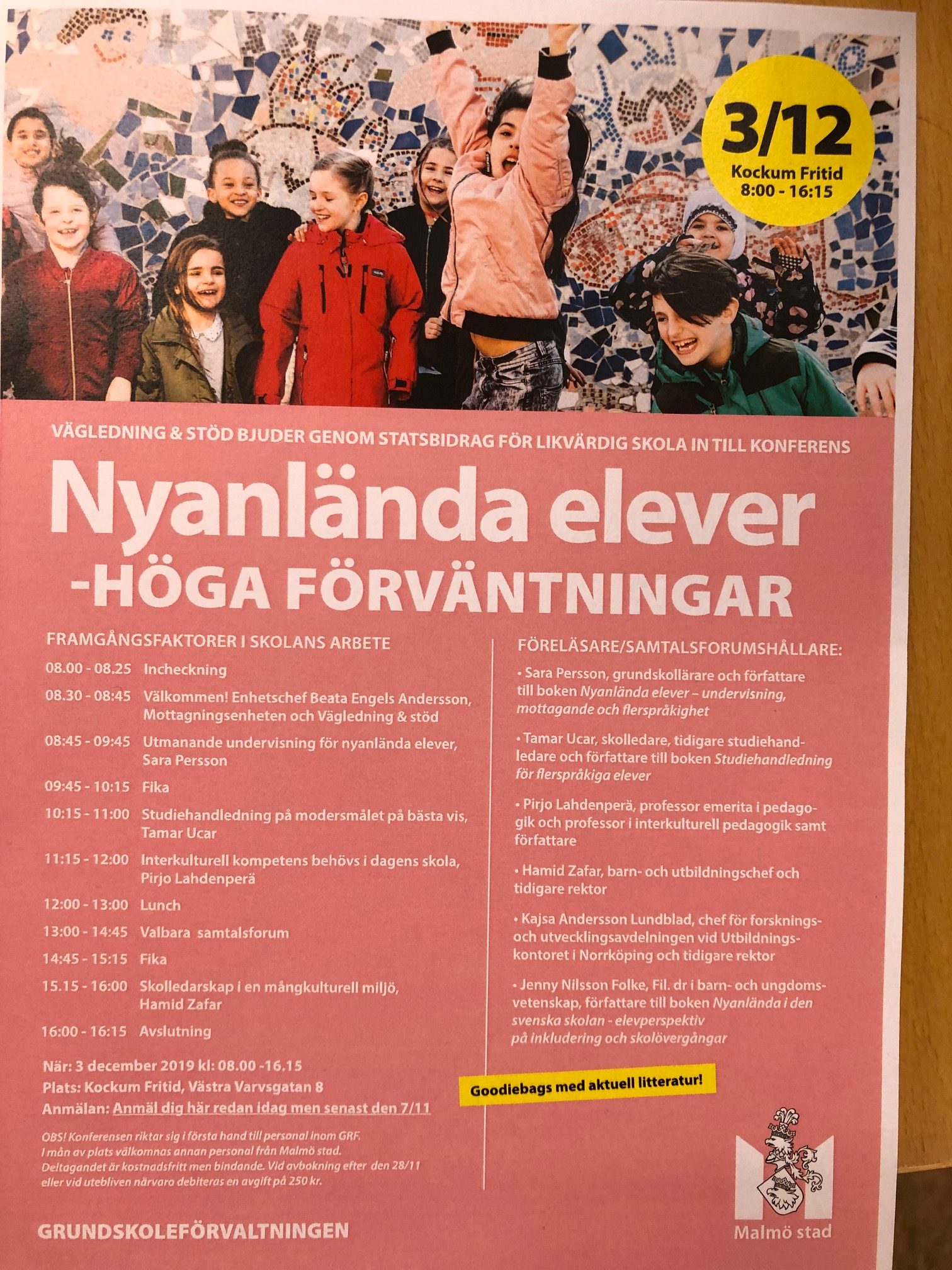 Programmet kan du läsa här och därifrån kan du också anmäla dig, och du måste vara inloggad på ditt skolkonto för Google för att kunna fylla i formuläret. Om du inte har en sådan inloggning så hör av dig till mailadressen nedan! Anmäl dig gärna redan nu men senast den 7/11. Välkommen till Kockum Fritid den 3/12 – Nyanlända elever – höga förväntningar, framgångsfaktorer i skolans arbete!