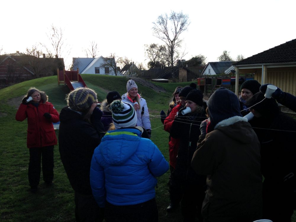 Vi inledde dagen med att använda våra sinnen och reflektera kring lärande. Därefter tittade vi på trädens knoppar om vintern och konstruerade hinderbanor år små små varelser som bor i en park i närheten av förskolan. I förskolans gårdsmiljö gjorde vi kolkritor och målade av varandra samt byggde enkla telefoner för att reflektera kring ljudvågor och teknik i förskolan. Vi kopplade upp oss alla på linjen och en av deltagarna började sjunga för oss andra på telefonen.