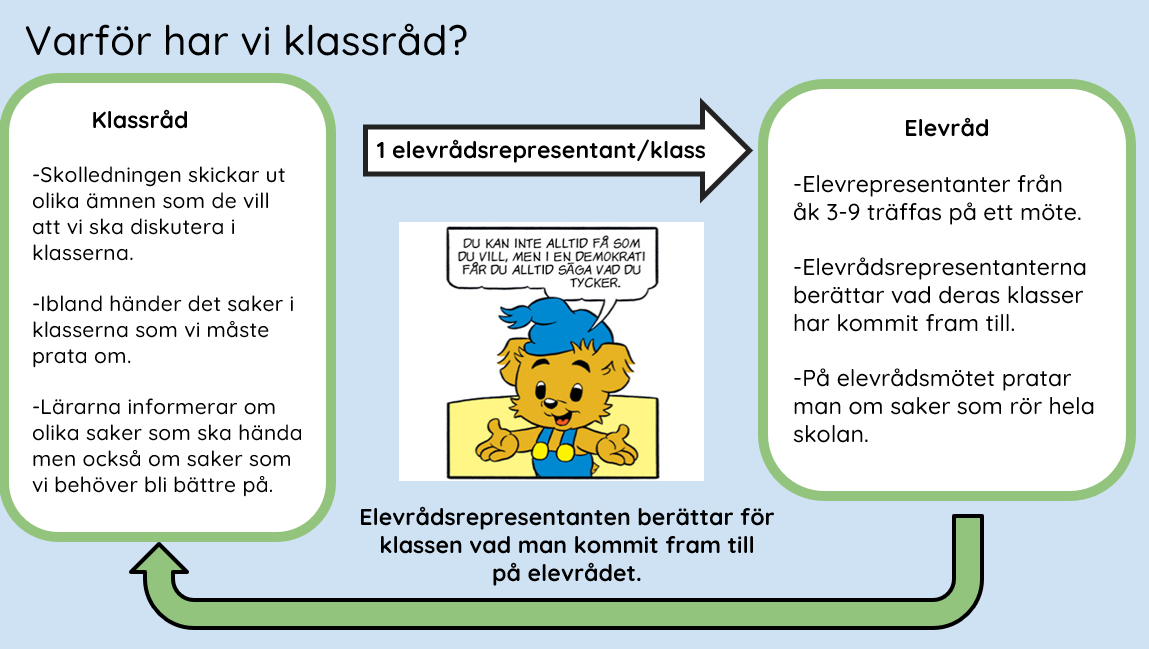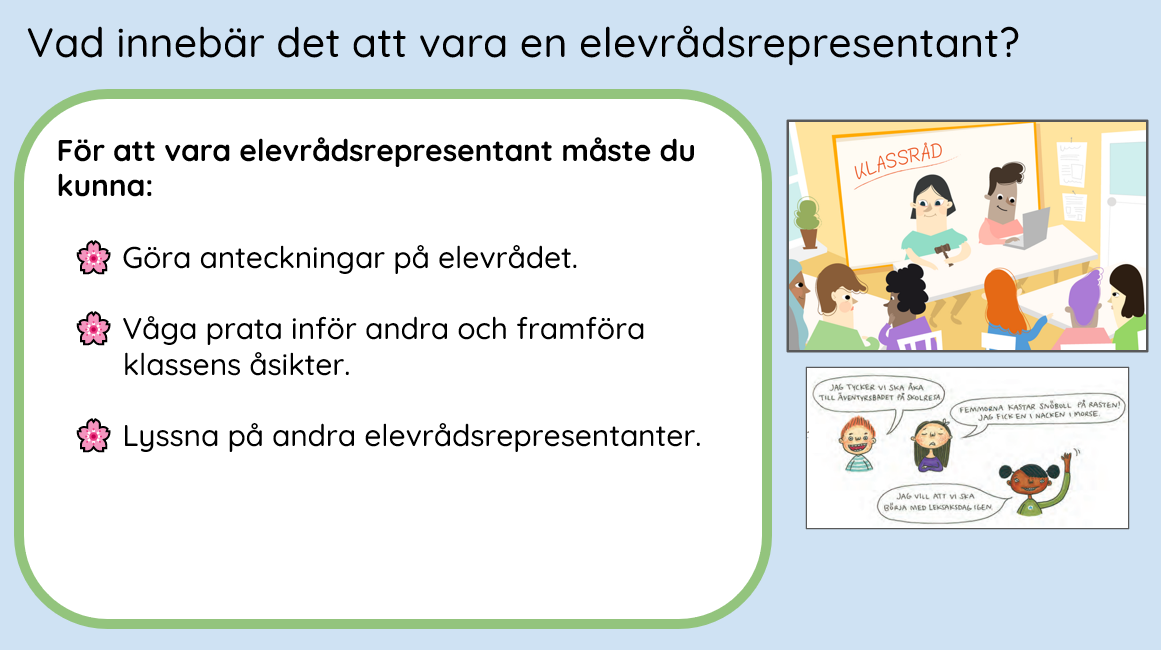 Skolverket (2022) skriver att elever har rätt till inflytande över sin utbildning och arbetsmiljö samt att de har rätt att hålla möten och organisera sig. Demokratiska forum där eleverna får möjlighet att påverka och ta ansvar för skolans verksamhet är bl a klassråd och elevråd.