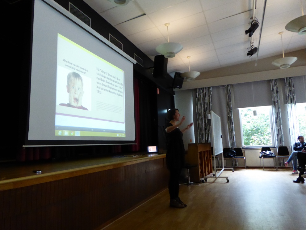 För att på ett konkret sätt synliggöra och diskutera dessa frågor fick lärarna delta i en värderingsövning som syftar till att utifrån ett maktperspektiv synliggöra, samt förkroppsliga hur den samhällstrappan vi lever i kan se ut. Just denna övning verkade ha gjort intryck då man tydligt kan se samt får möjligheten att leva sig in i en roll som förtydligar svårigheterna med hur bland annat de sociala, fysiska samt ekonomiska förutsättningar speglar den plats i samhället man har möjlighet att ta. För att knyta an till normer och fördomar höll sedan vår kollega Selma i en föreläsning om begrepp som rasifiering, vithetsnormen och makttrappan.