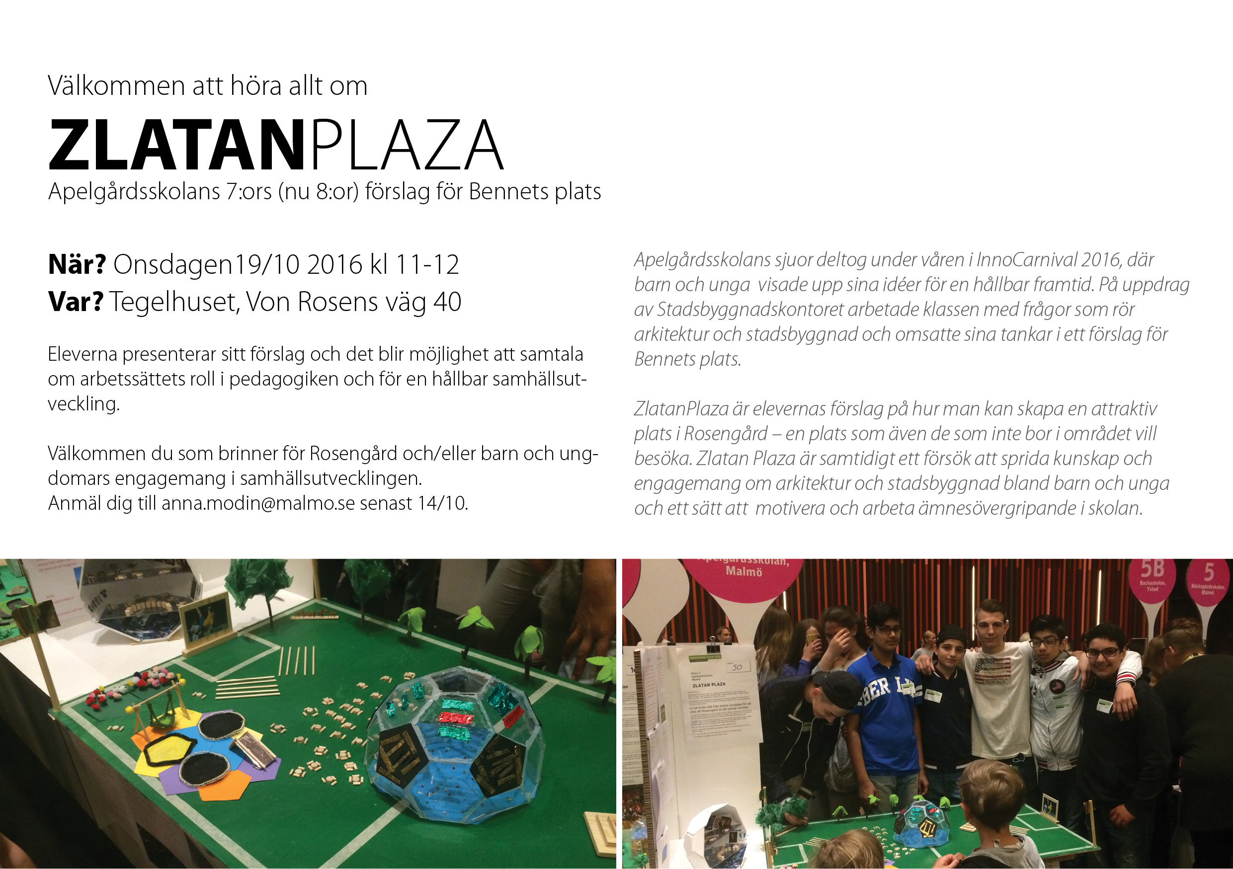 Våra elever representerades av Ammar, Gzim och Sanadie. De gjorde en mycket fin presentation av sina och klasskamraternas idéer och arbete med det ämnesövergripande projektet Zlatan Plaza inför en publik på ett tjugotal intresserade personer.